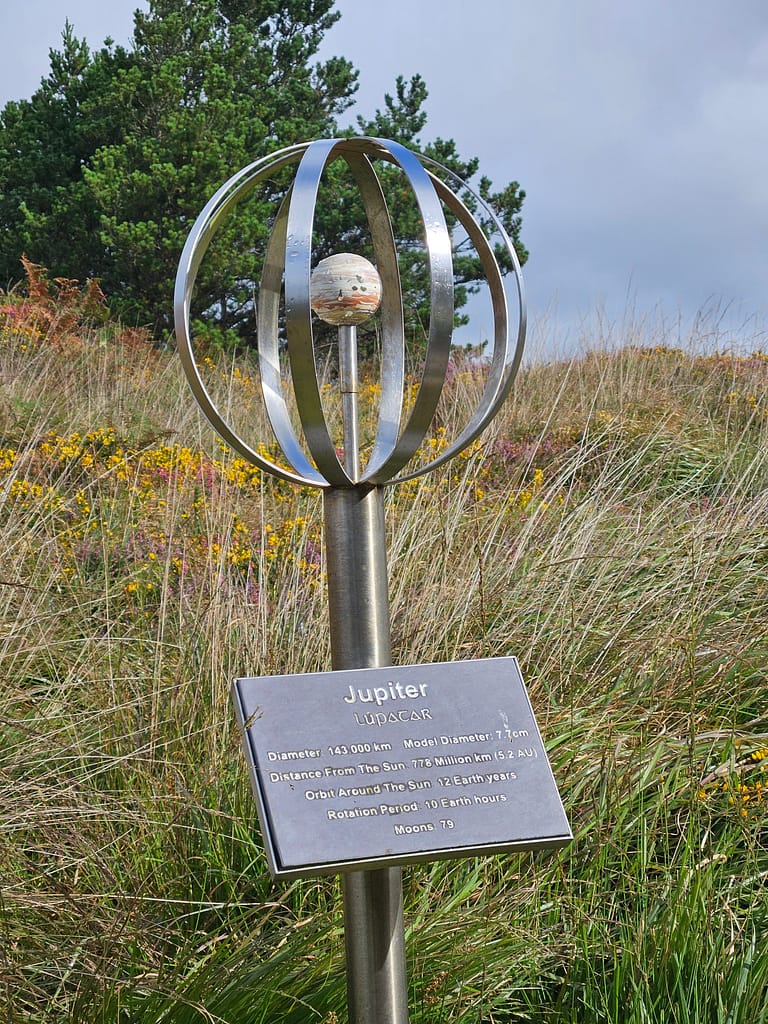 After breakfast at the campsite overlooking the Atlantic, I walked back to Caherdaniel. From Caherdaniel, I began the first section of the trail. At the beginning of the trail, there were statues representing the planets; the distance between the statues was determined by the distance between the planets. After examining the statues and their descriptions, I noticed rain clouds in the distance.